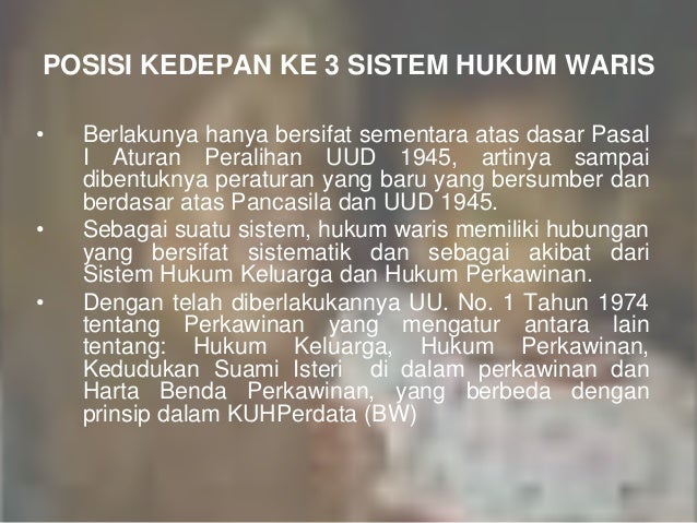 2. hukum waris islam. hukum waris islam berlaku bagi masyarakat indonesia yang beragama islam dan diatur dalam pasal 171-214 kompilasi hukum indonesia, yaitu materi hukum islam yang ditulis dalam 229 pasal. dalam hukum waris islam menganut prinsip kewarisan individual bilateral, bukan kolektif maupun mayorat. Waris secara umum berarti pemindahan harta dari pihak yang sudah meninggak kepada orang lain yang merupakan ahli warisnya. warisan dalam islam diatur dalam fiqh atau hukum waris islam atau mawaris dalam islam. hal pesoalan waris bukanlah hal yang sepele karena dampak yang ditimbulkan jika tidak diatur oleh allah swt. Sistem hukum waris di indonesia terbagi atas 3 yaitu hukum waris barat, adat, dan islam. hukum waris di indonesia belum ada keseragaman hukum karena masyarakat indonesia yang terdiri dari berbagai. Harta waris disebut juga harta tanpa tuan, sebab pemilik awal harta tersebut sudah tiada. hal ini bisa disebabkan karena sang pemilik telah meninggal dunia maupun pergi dalam waktu yang sangat lama tanpa keterangan dan kepastian kapan kepulangannya.